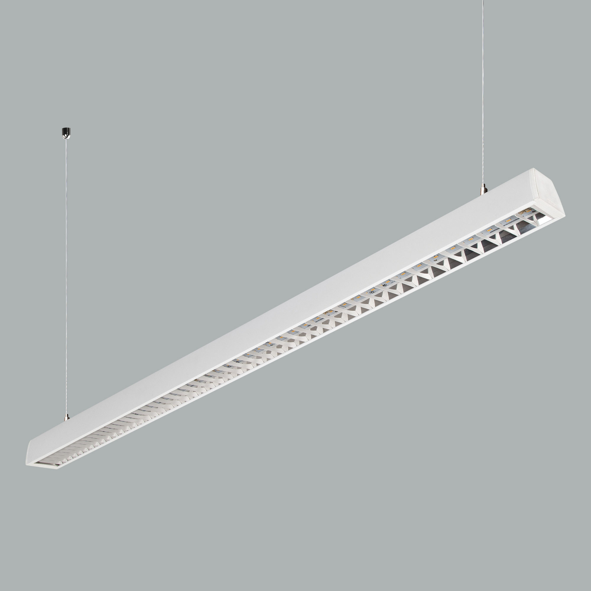 Opal diffuser and white painted raster louver on top..